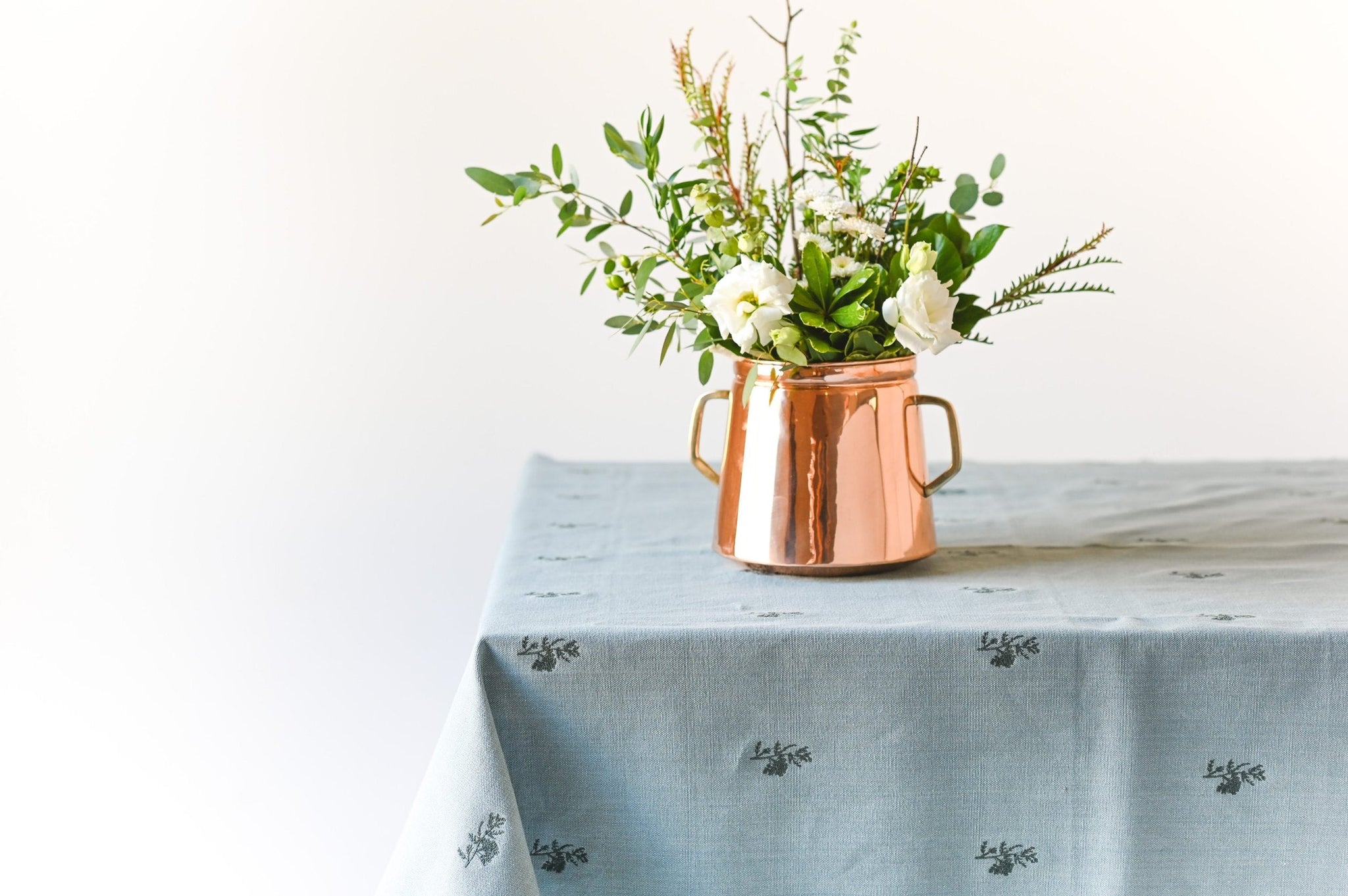 Inspired by the European Countryside, our linen tablecloths were designed to be a versatile piece in every home. Whether you are wanting a formal table spread or simply a casual setting, these linen tablecloths are just the thing. Cotton tablecloth; Gray/blue color with darker blue embroidered flowers.